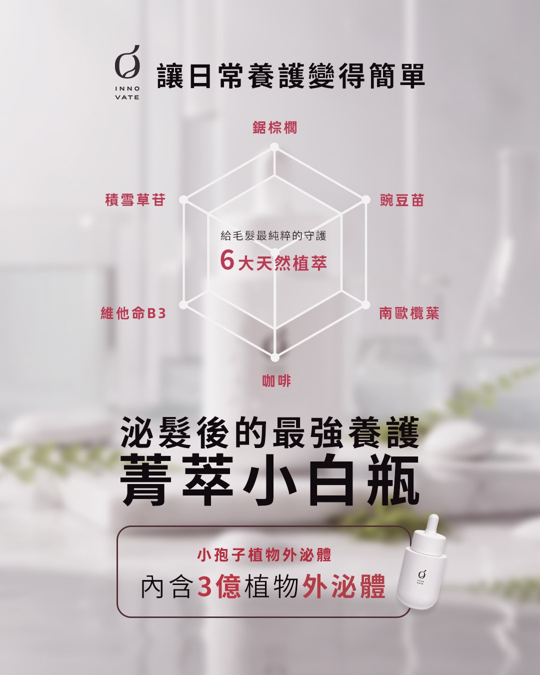 主成份:靈芝外泌體,Procapil育髮因子,豌豆萃取,積雪草苷,鋸棕櫚萃取,維他命B3,咖啡因。